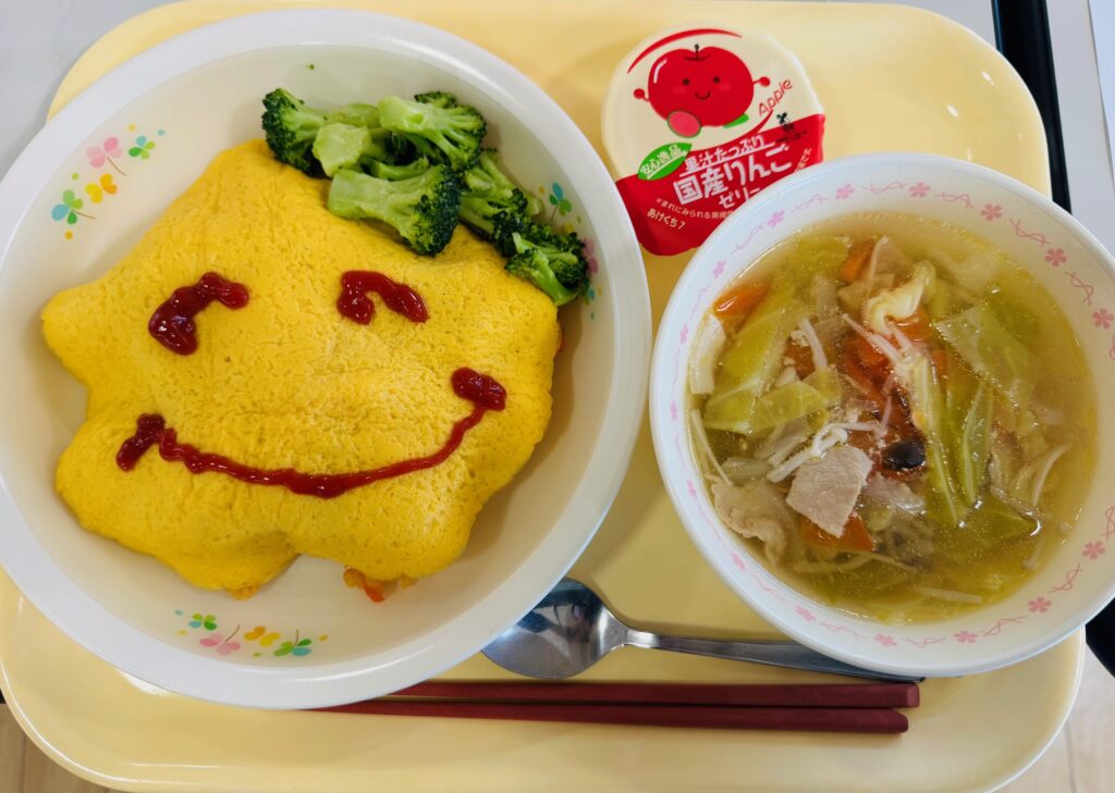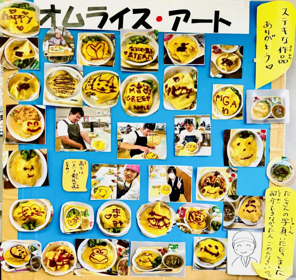 給食のメニュー「オムライス」に合わせて、栄養教諭の長野先生から「今年もオムライスアートを行います!」とのお知らせがあり、みなさんの作品がたくさん集まりました。とてもかわいらしい作品ばかりで、見ているだけで楽しくなります!