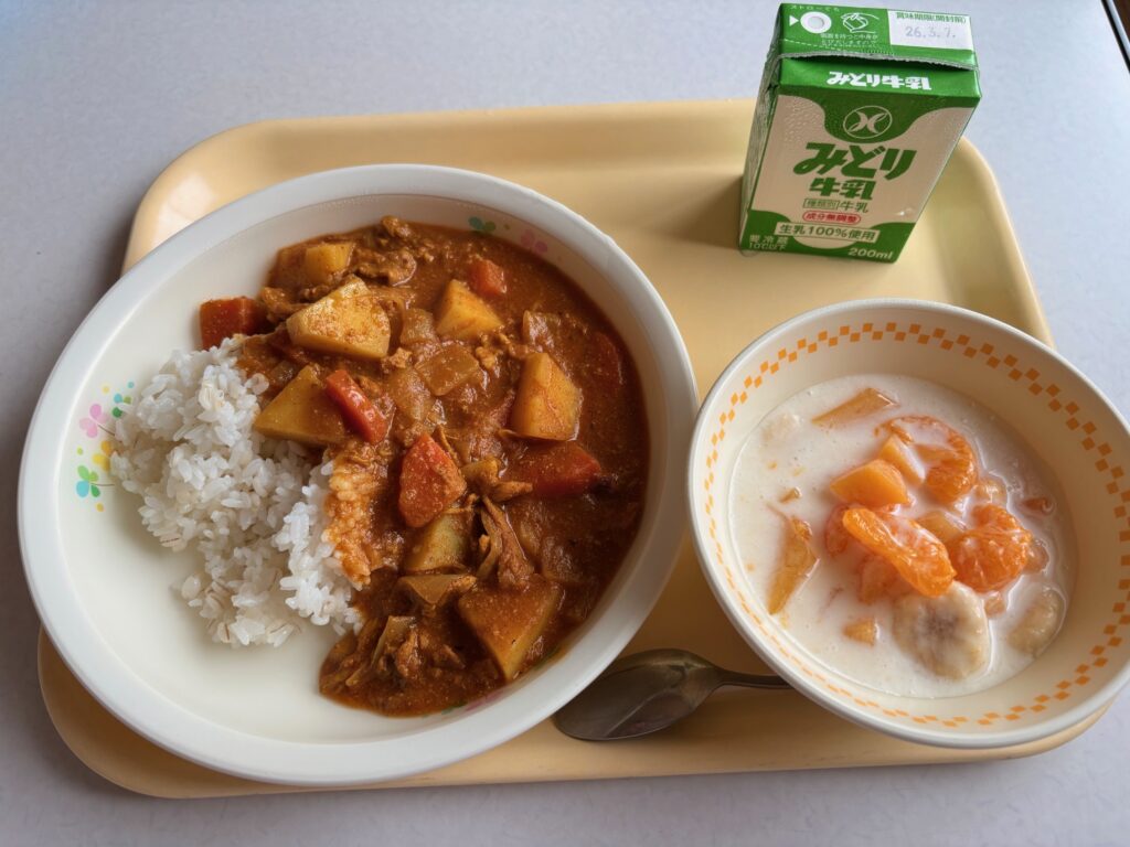 2月26日(木)今日の給食は、みんな大好きポークカレー! 今週は卒業学年のリクエストメニューが続いており、カレーは特にたくさんのリクエストが寄せられたそうです。 今日は教室中に笑顔が広がり、みんなでおいしくいただきました!