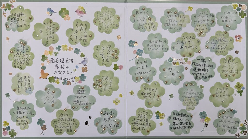 南石垣支援学校で過ごす最後の日、「南石垣ありがとうの会」を開きました。児童生徒会が中心となって準備や進行を行い、これまで学校を支えてくださった地域の皆様をお迎えしました。会の中では、私たち一人ひとりが、日頃の活動や行事でお世話になったことへの感謝の気持ちを自分の言葉で伝えました。地域の皆様からも温かいメッセージをいただき、南石垣で過ごした時間がどれほど多くの人に支えられてきたのかを改めて感じることができました。