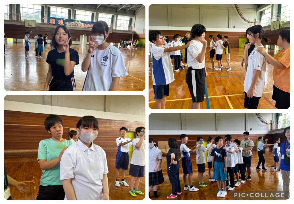 9月18日(木)に佐伯南中学校の生徒と交流学習を行いました。自己紹介をしたり、ジャンケン列車やだるまさんが転んだ、いろ鬼などを通して、楽しみながら交流をすることができました。自己紹介タイムでは、名札を作ってもらいお互いの名前を覚えることもできました!