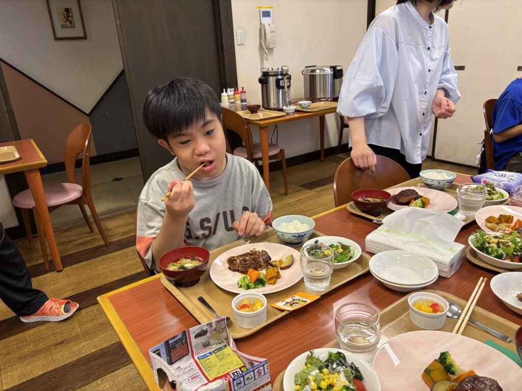 夕食はハンバーグ!みんなでワイワイと食事を楽しみ、にぎやかで楽しい時間を過ごしました。